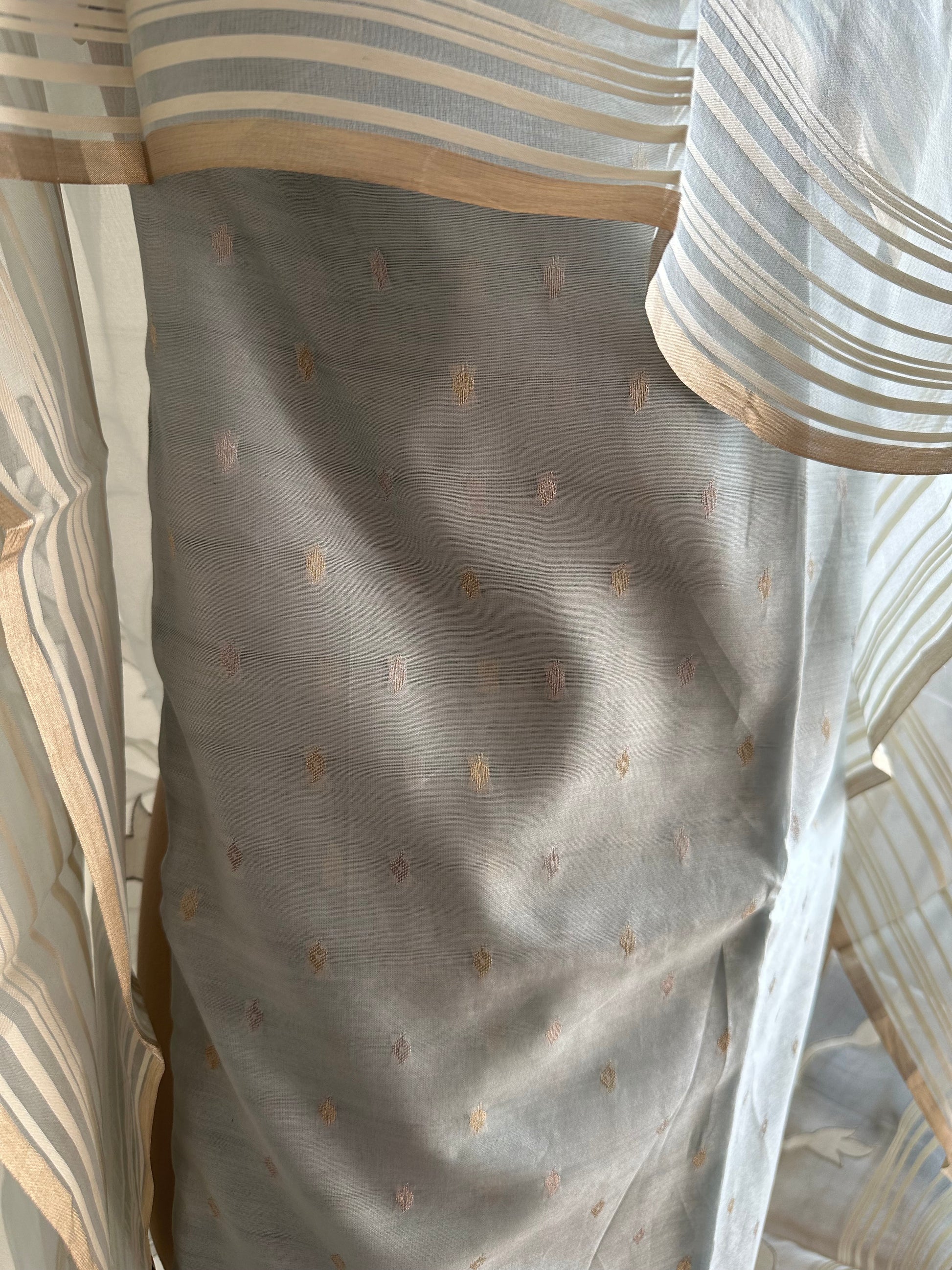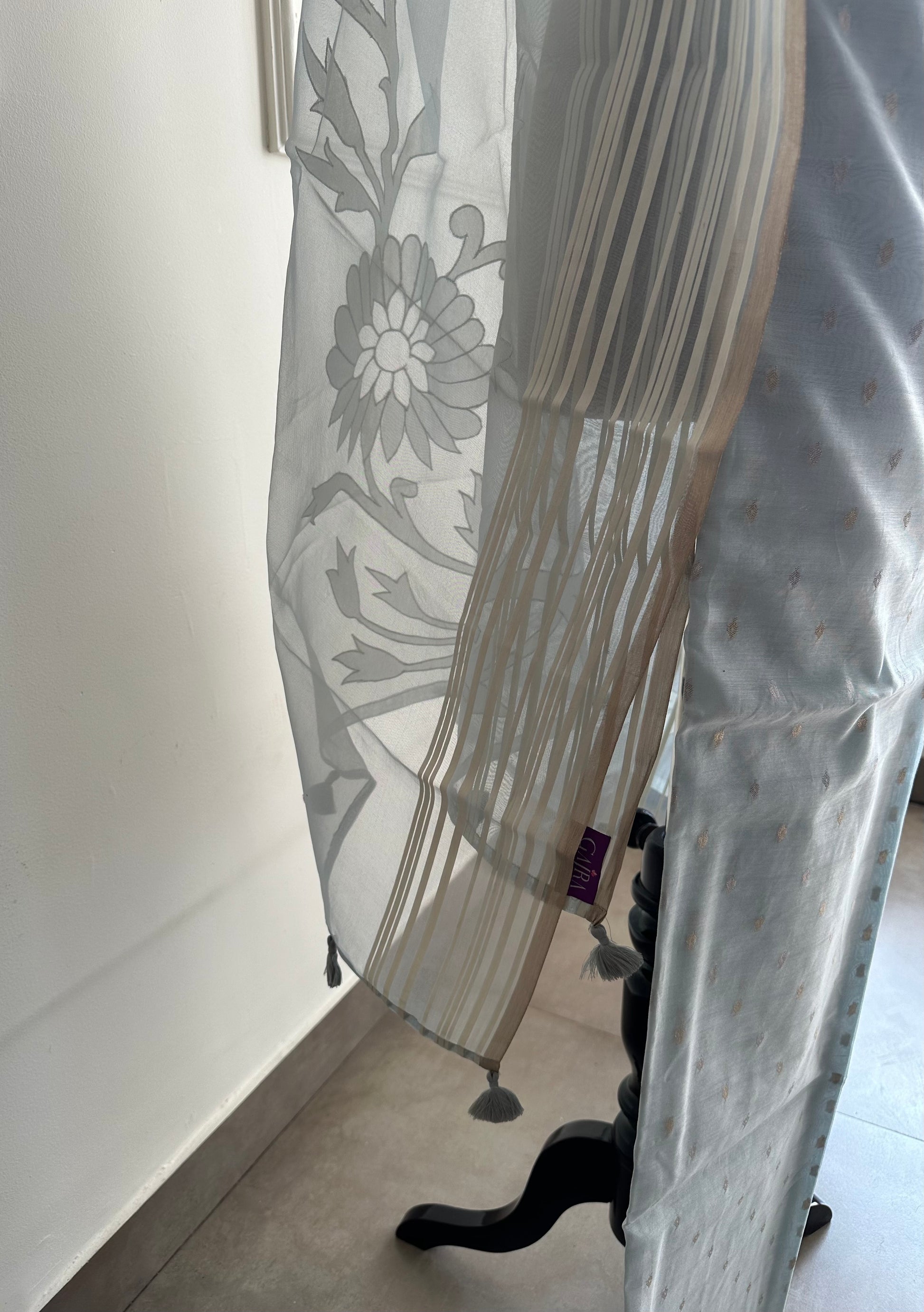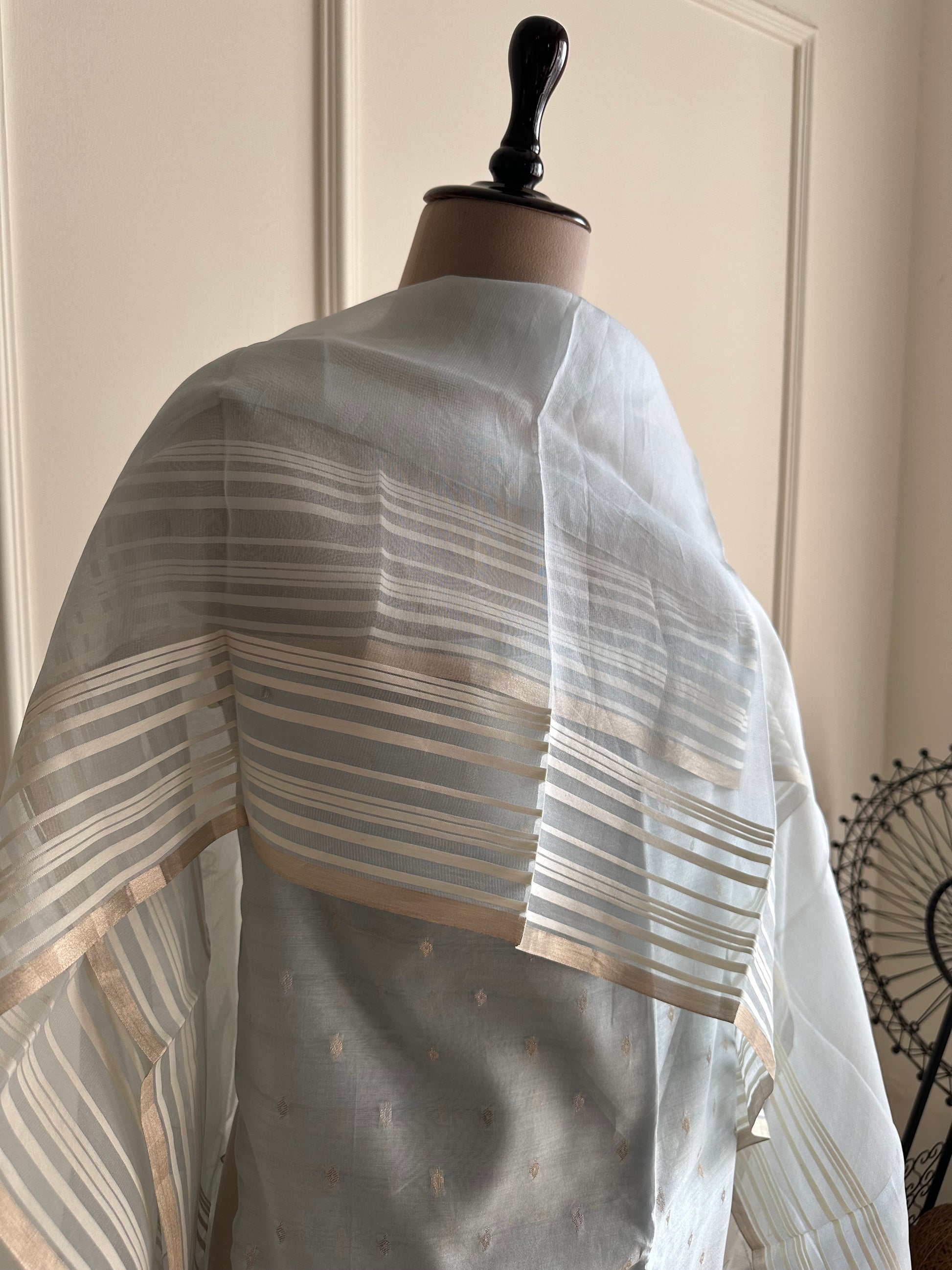 Embrace understated elegance with this Powder Blue Suit Set, crafted from hand-woven Banarasi cotton silk. The lightweight kurta is adorned with intricate Sona Rupa Banarasi bootis, offering a touch of traditional luxury.