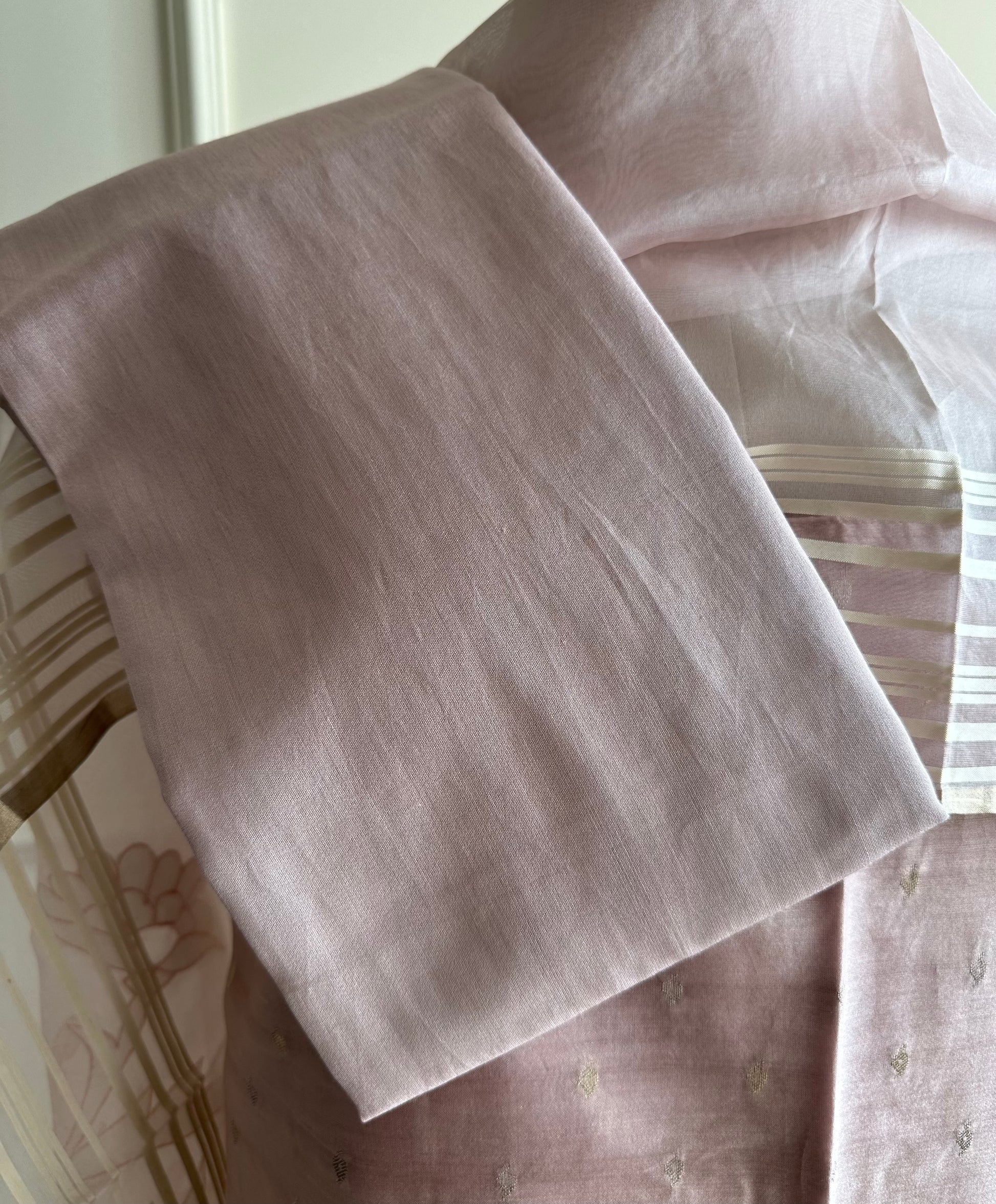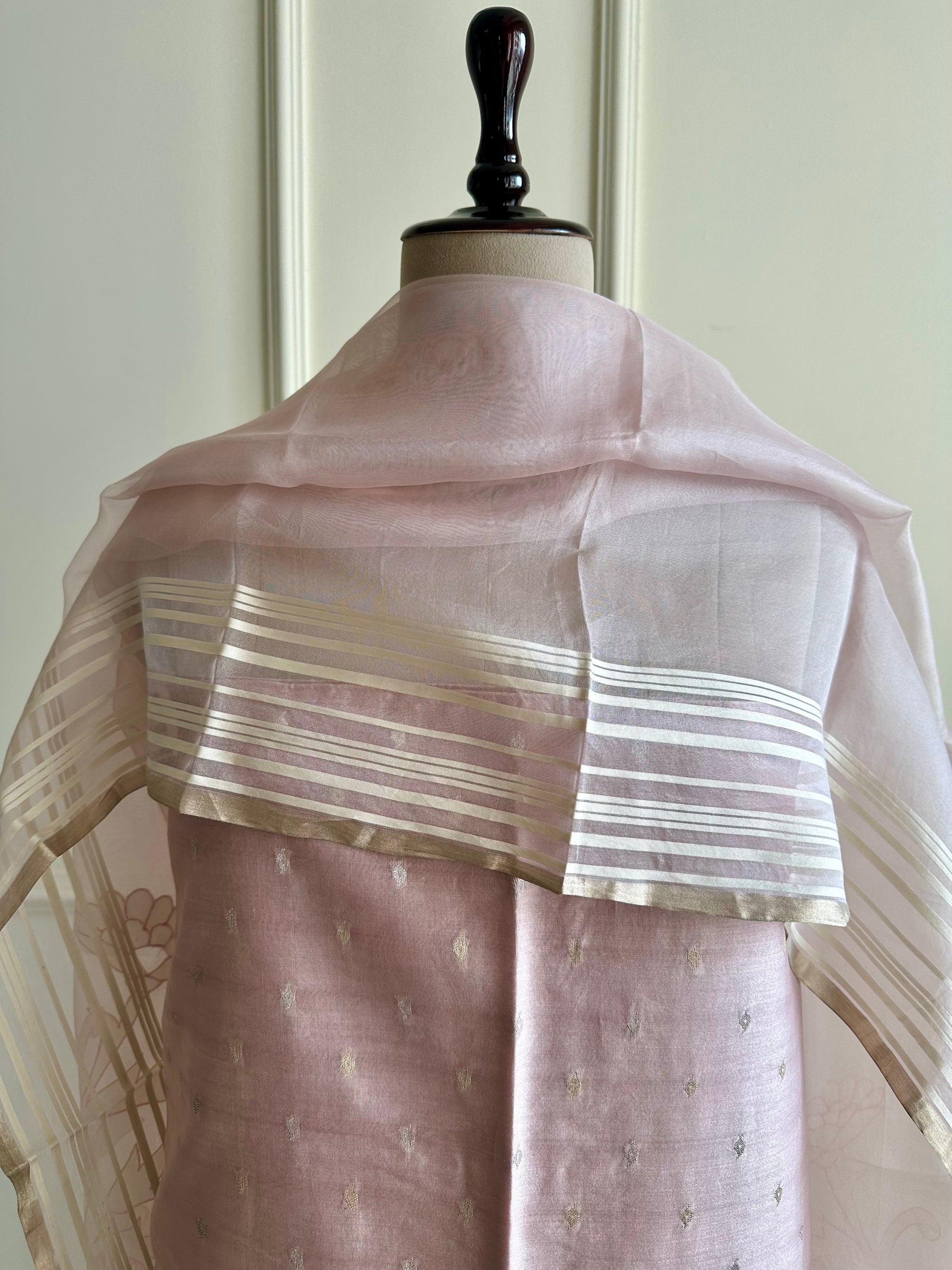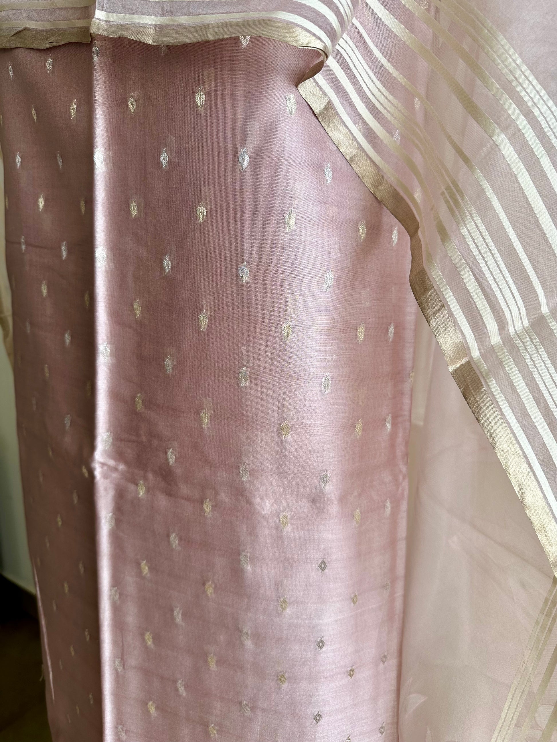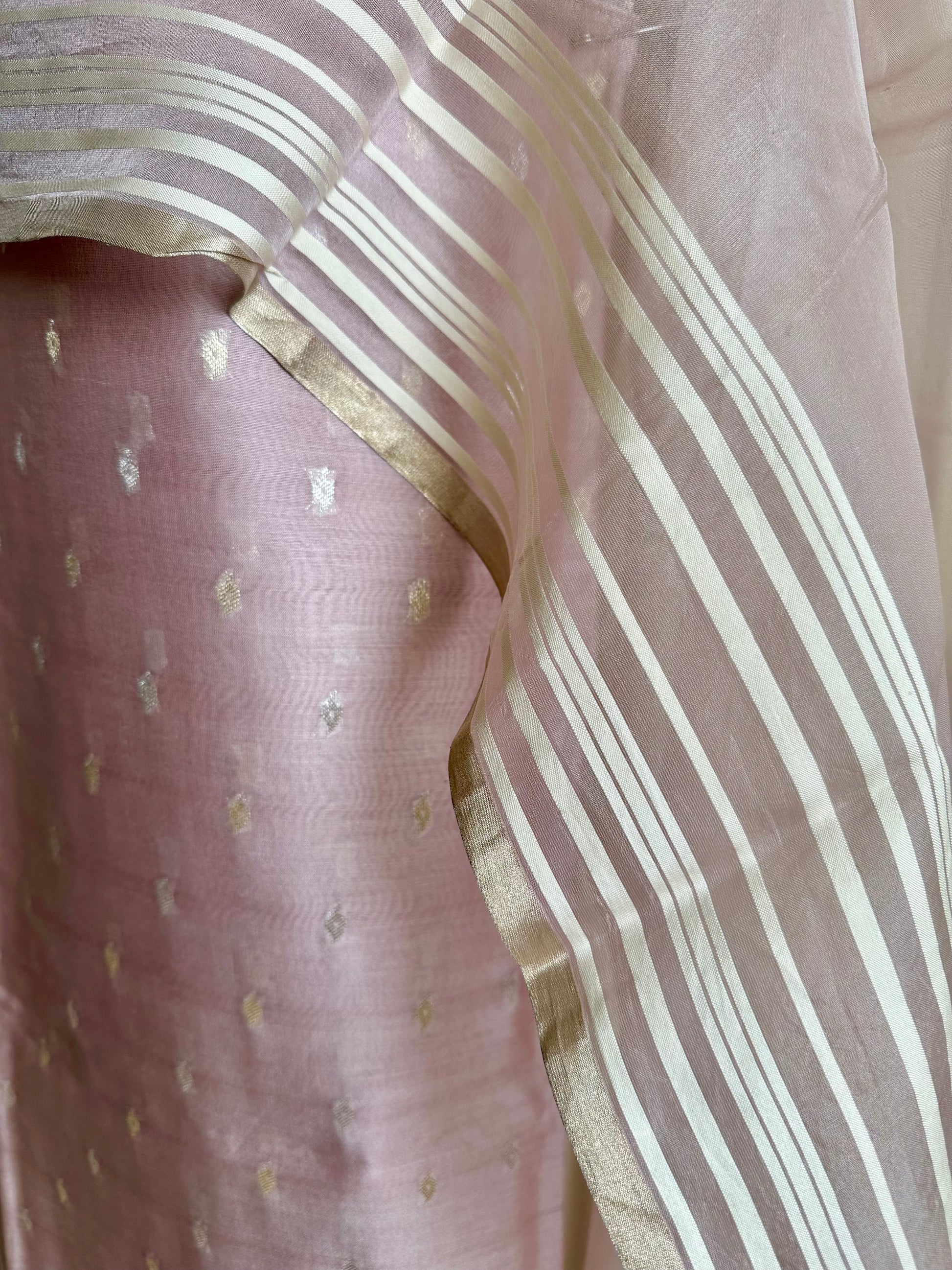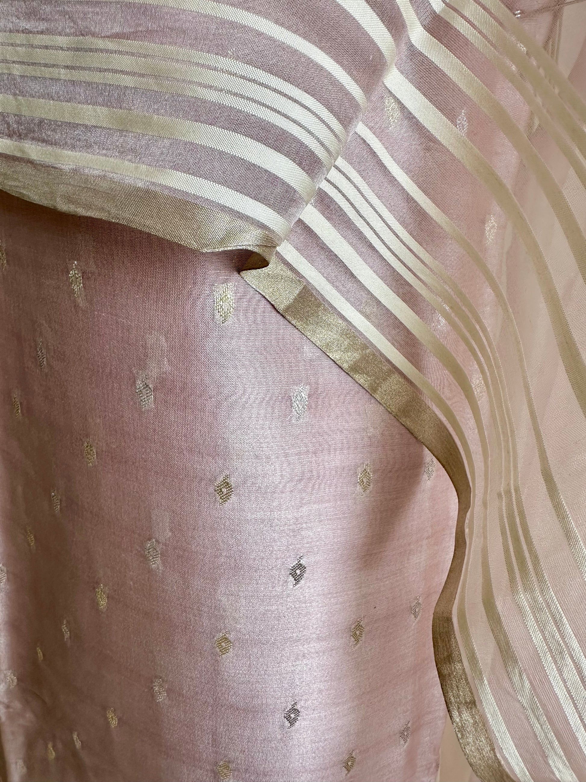 Embrace understated elegance with this Dusty Rose Suit Set, crafted from hand-woven Banarasi cotton silk. The lightweight kurta is adorned with intricate Sona Rupa Banarasi bootis, offering a touch of traditional luxury.