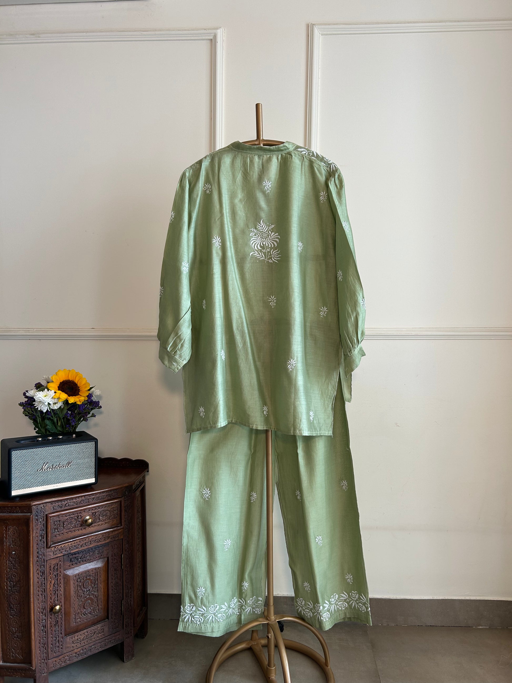 Light and graceful, this mint green mul chanderi co-ord set blends tradition with a modern edge. The shirt-style top features front buttons, a striking rose belt, and floral bootis on bell sleeves, while the back stuns with a bold floral motif and scattered accents.
