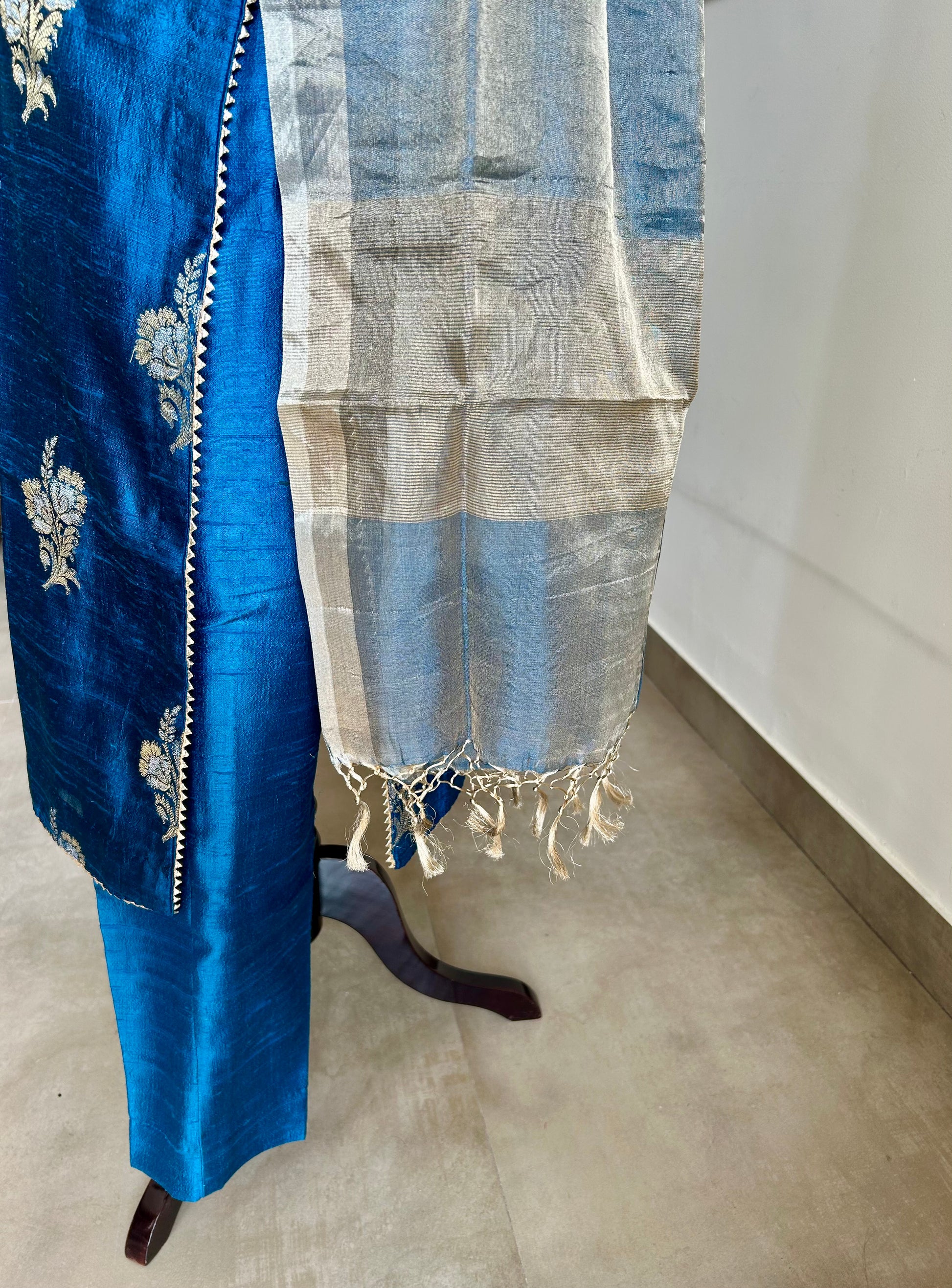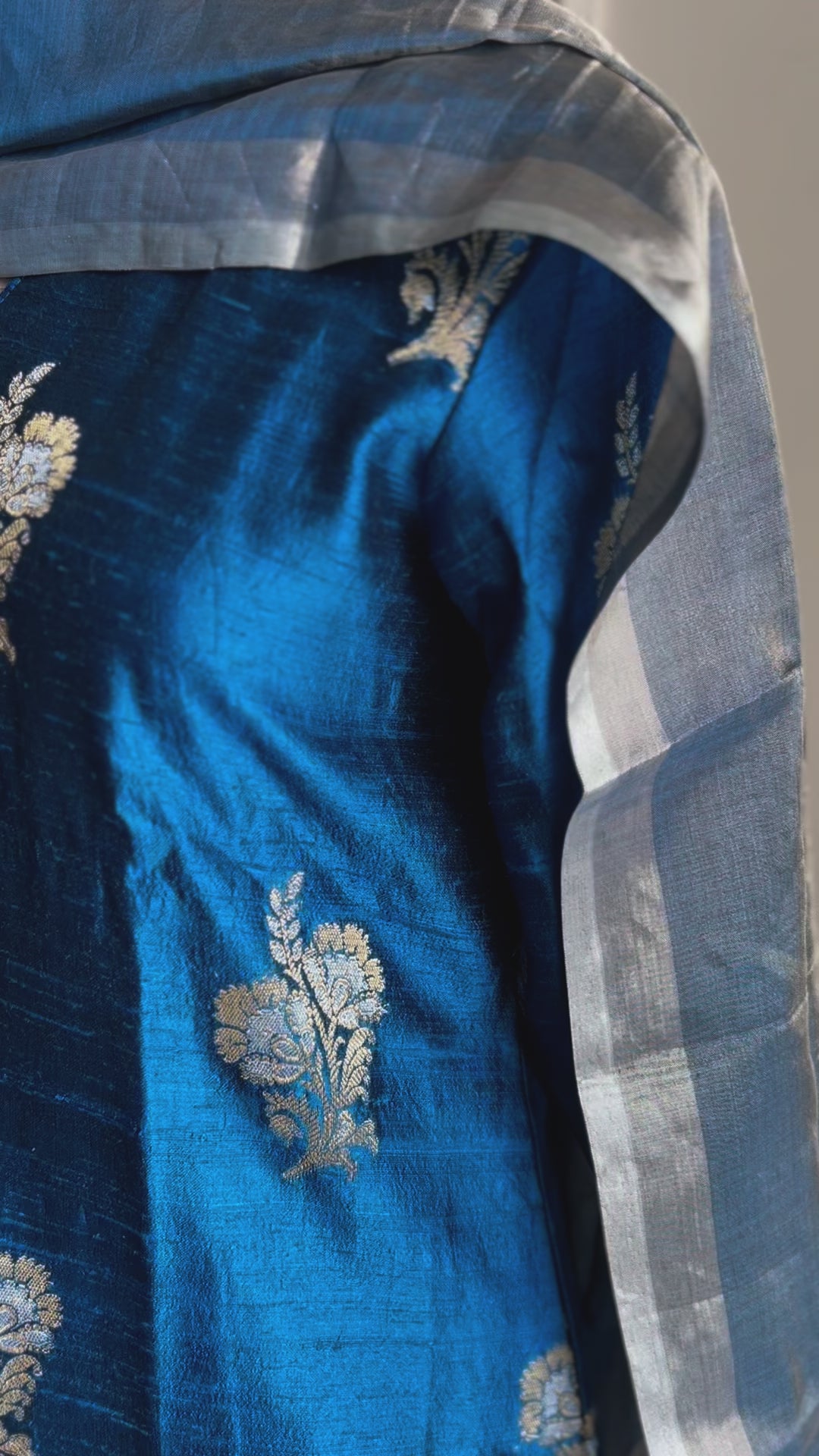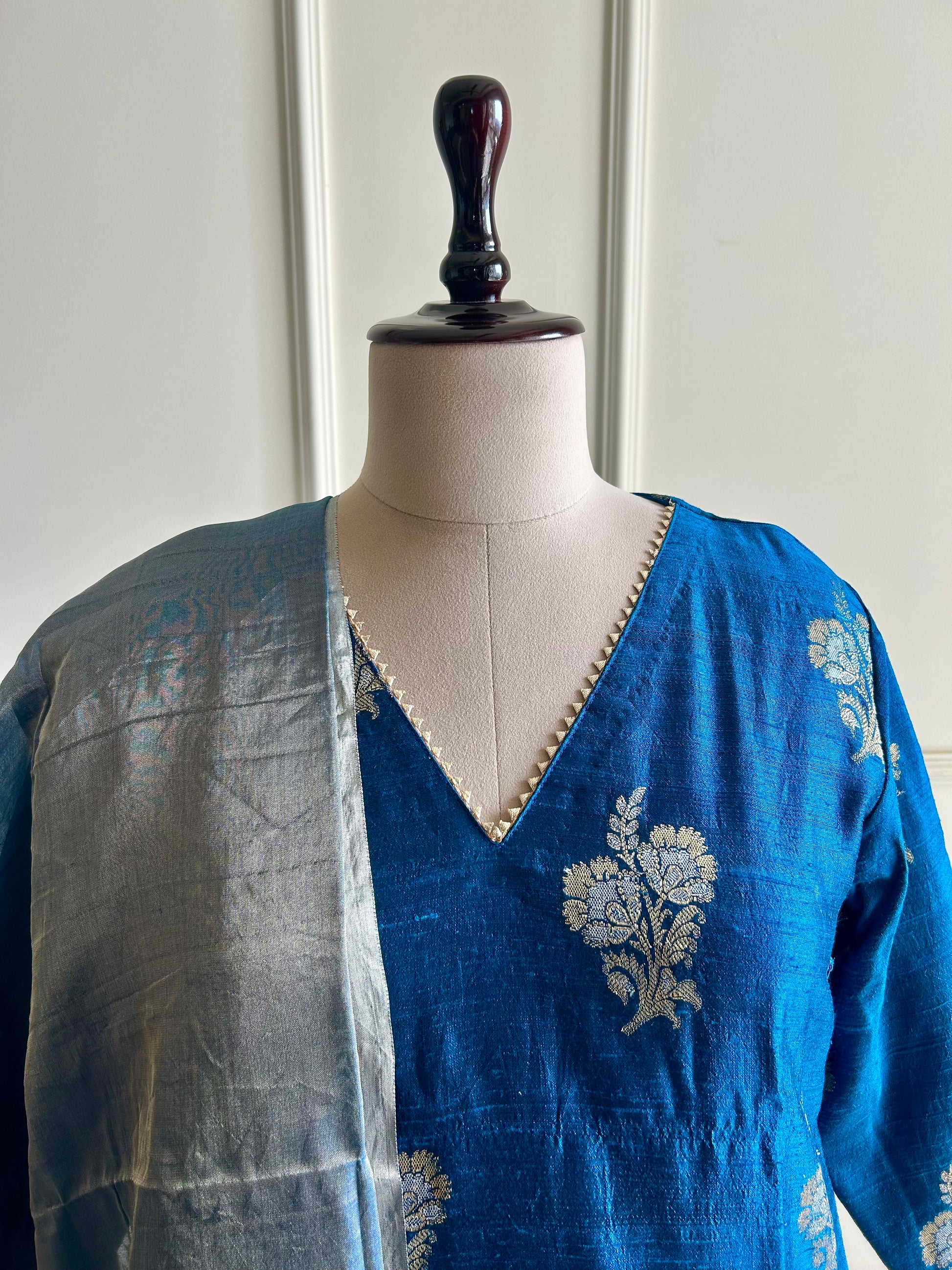 Elevate your wardrobe with this exquisite blue suit set, crafted from luxurious raw silk. The kurta features a flattering V neckline, adorned with stunning sona rupa big Banarasi floral motifs and finished with delicate bijiya gota lace for an added touch of elegance.