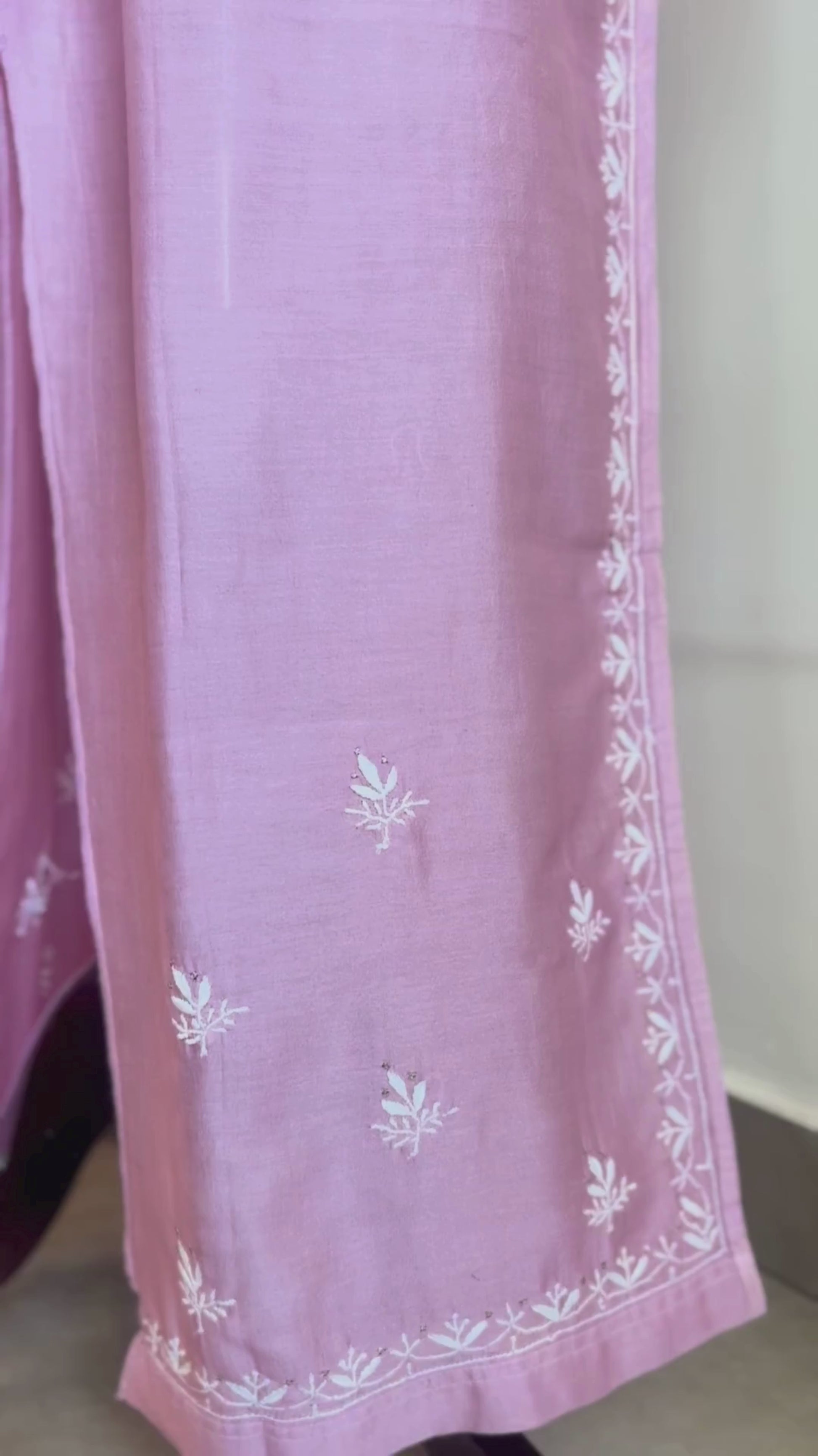 Refined and versatile, this lilac mul chanderi co-ord set showcases elegant chikankari with keel kangan motifs on the front and floral bootis on bell sleeves. Ghaas patti details enrich the pants and back, blending tradition with sophistication.