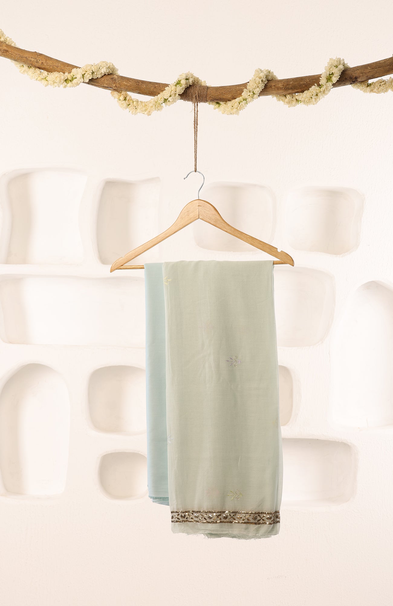 Discover our exquisite Firozi Suit, crafted from super light mulmul fabric for unrivaled comfort & elegance. Adorned with intricate Mukaish on the neckline & a floral jaal of Ek Taar Resham work, this suit is a masterpiece of traditional craftsmanship. The mulmul used in the kurta is so fine that it effortlessly passes through a ring- a testament to its exceptional quality & craftsmanship.