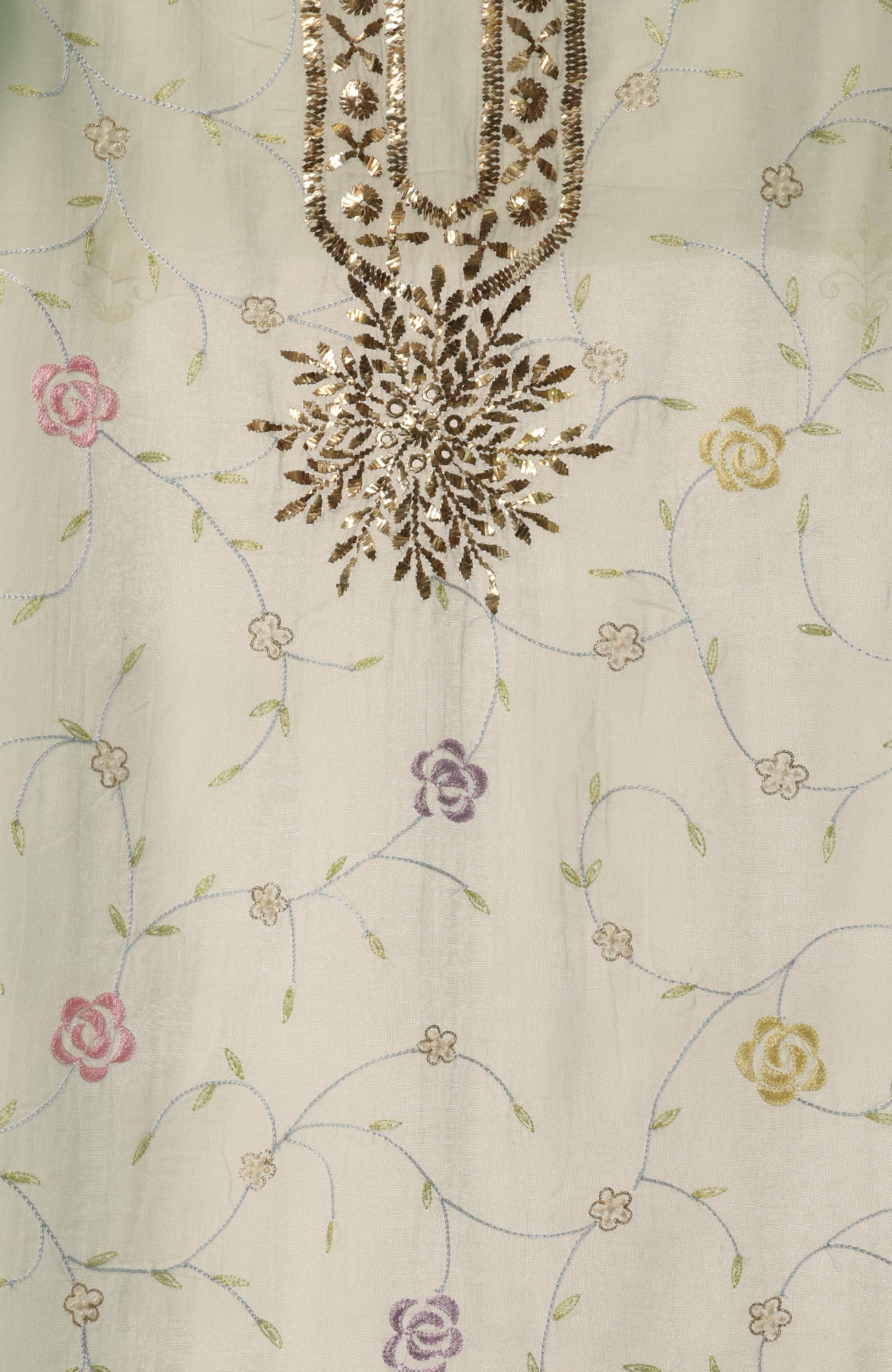 Enhanced with beautiful Kasab (Zari) & Pearls, each detail adds to its unique allure. Perfect for special occasions, this delicate suit promises to captivate with its luxurious blend of intricate design & light-weight charm.