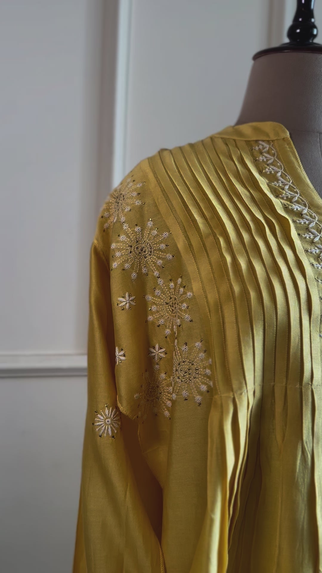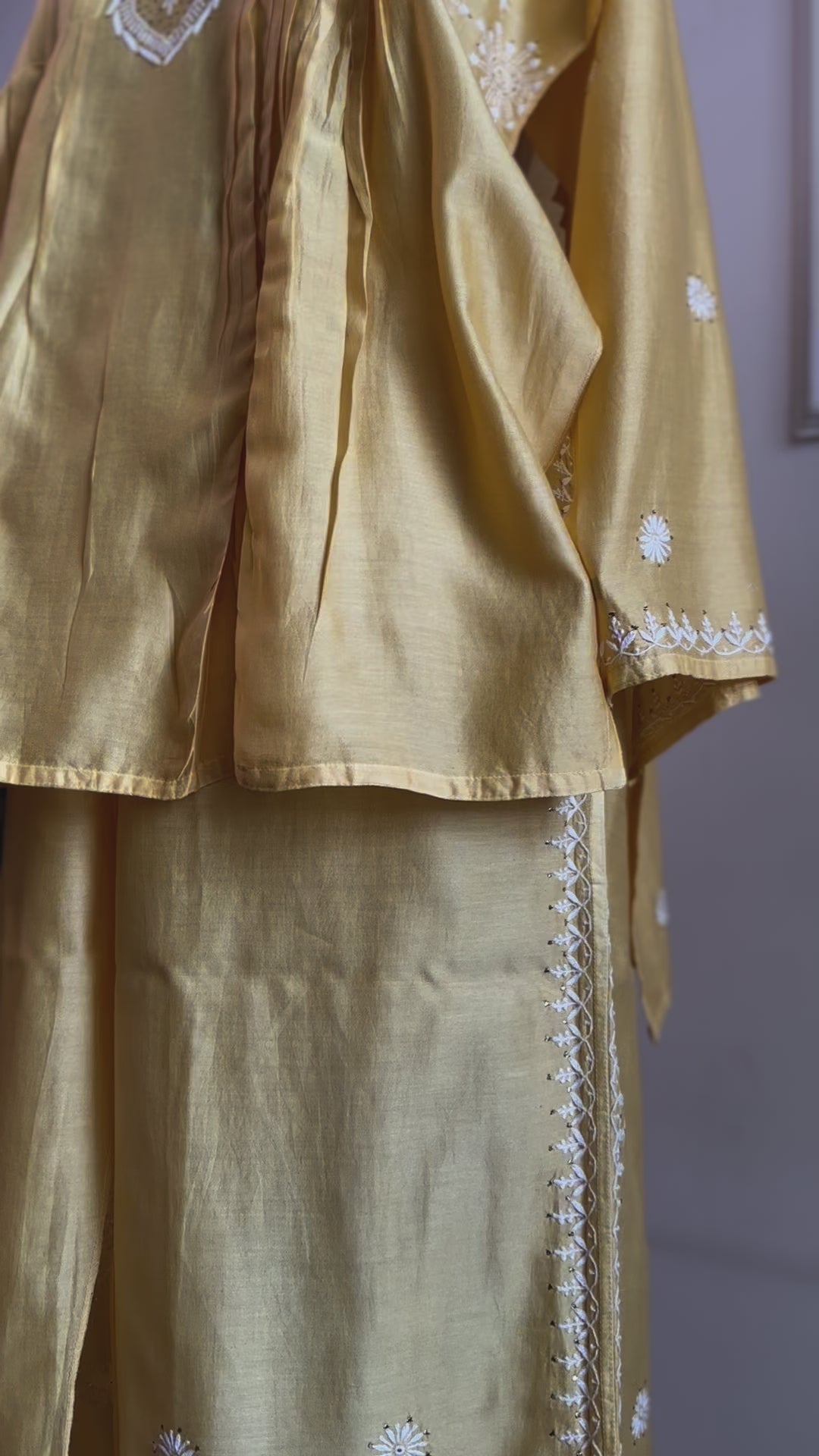 Tailored in soft mul chanderi, this golden yellow co-ord set exudes festive grace. Chikankari and pintex detailing pair with a paan neckline and floral bootis, while the back blooms with elegant motifs.
