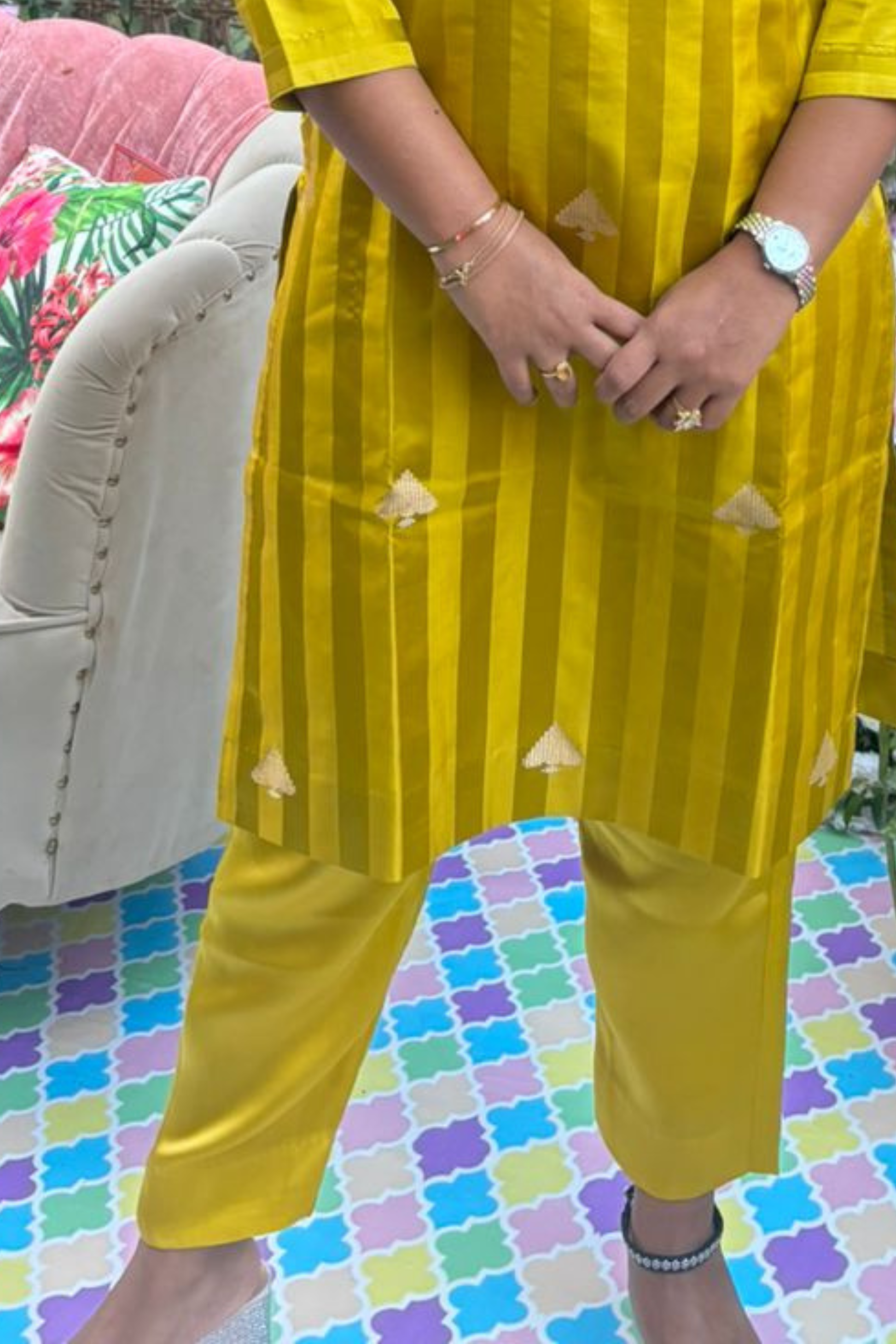 Discover the perfect blend of Indian luxury and modern comfort with our Lime co-ord set. The kurta, crafted from pure hand-woven silk, features a V-neckline and a striking combination of contemporary stripes with intricate Banarasi kadhwa bootis all over.