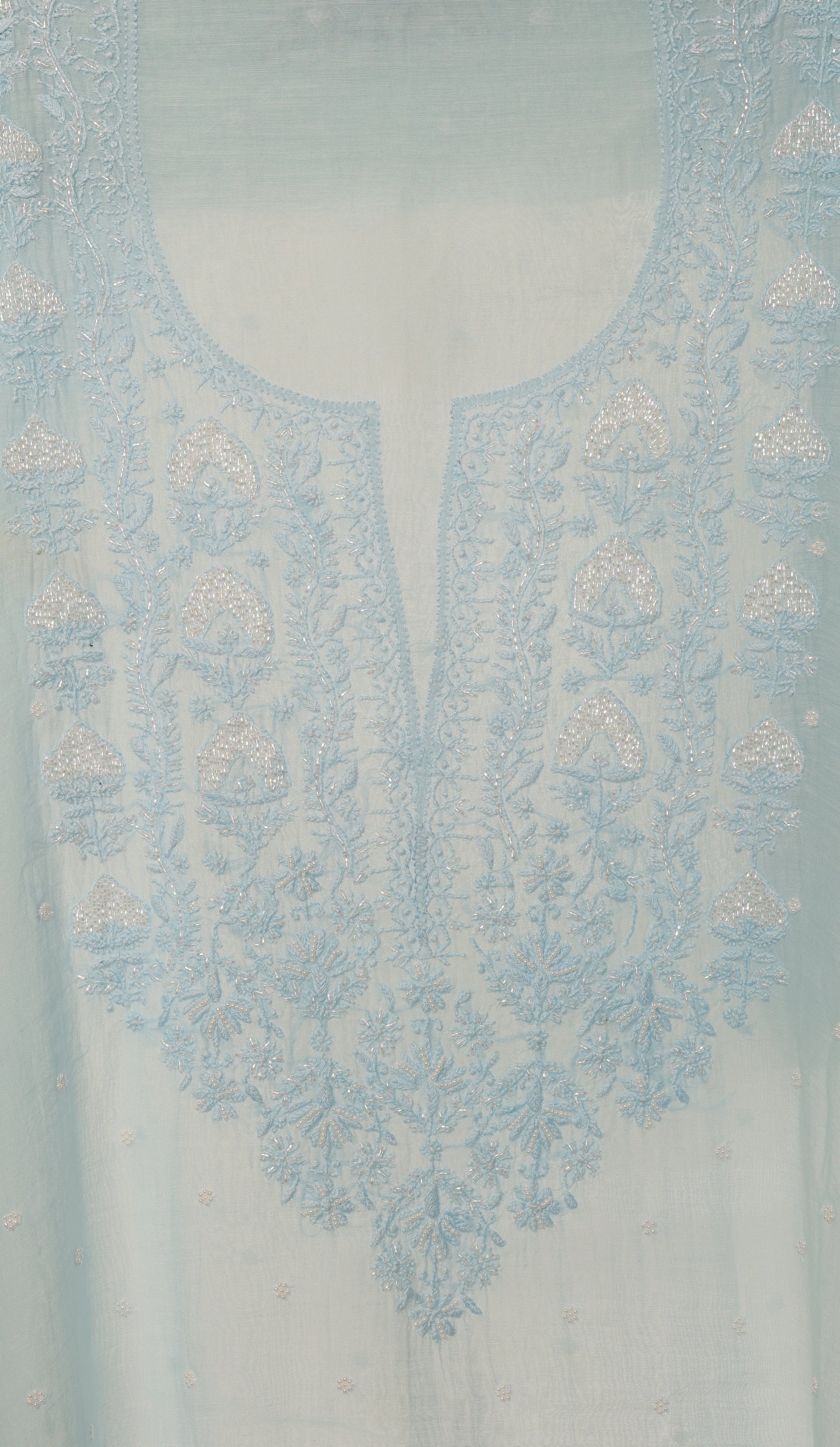 Delicate Moti & cutdana work add a touch of luxury, while Bakhiya, Fanda, Ghaas Pattti, Penchni, & Murri stitches enhance its intricate detailing. In a mesmerizing powder blue hue, this suit epitomizes contemporary sophistication.