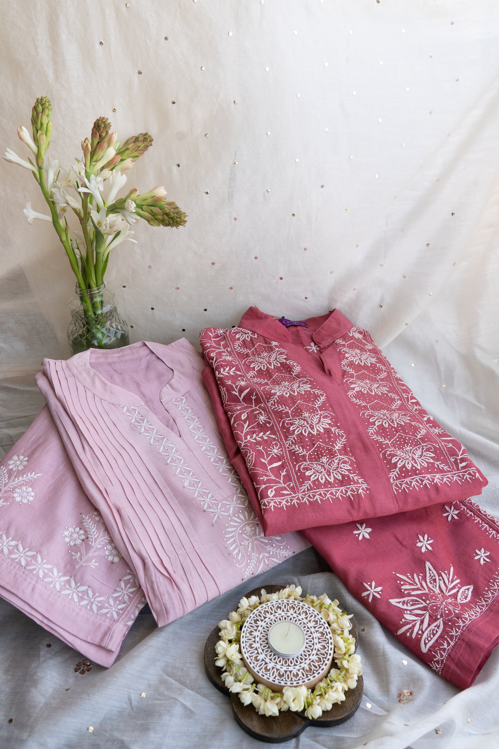 Navira- Light Maroon Chikankari Co-ord set in Mul Chanderi