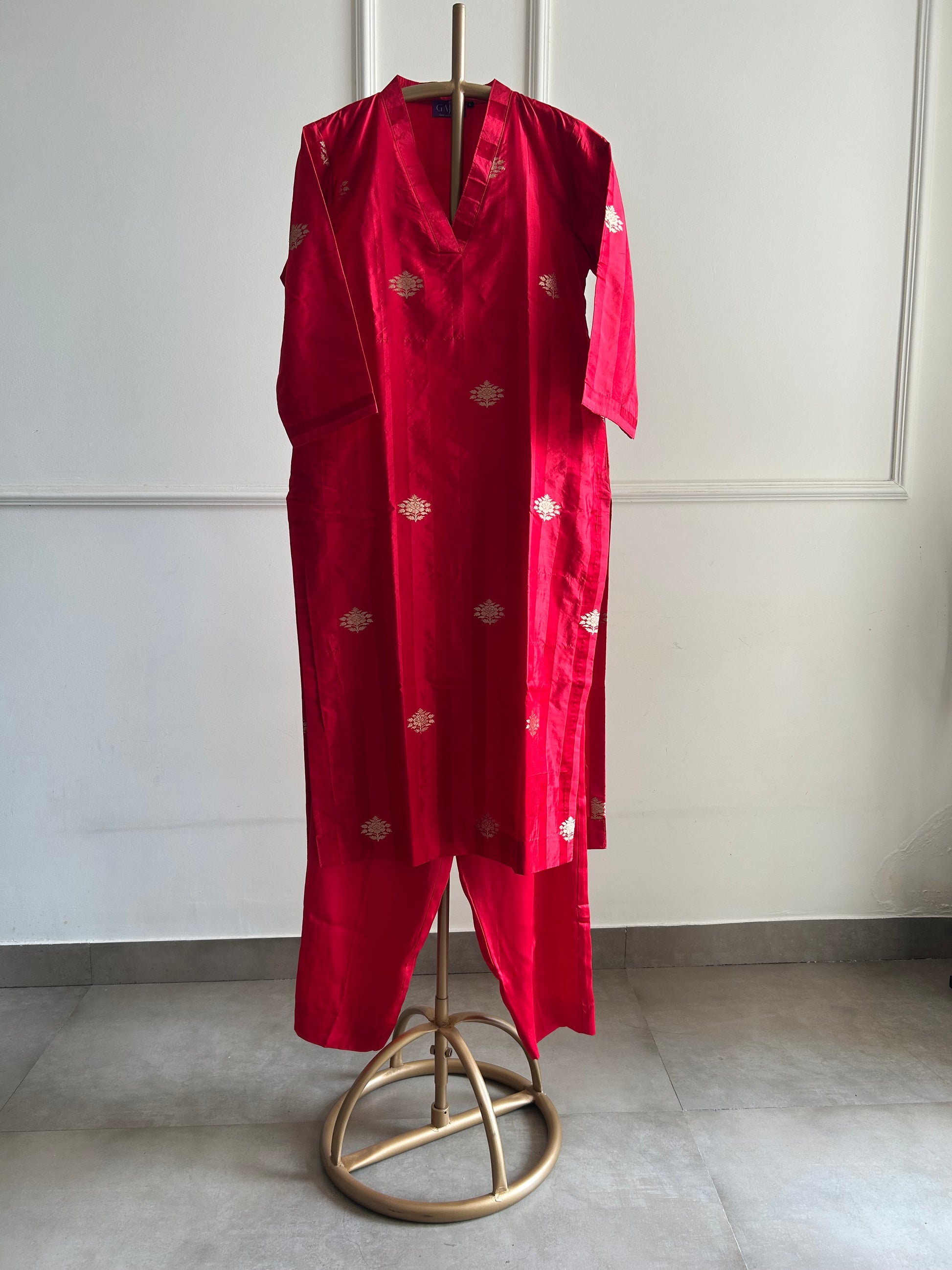 Discover the perfect blend of Indian luxury and modern comfort with our red co-ord set. The kurta, crafted from pure hand-woven silk, features a V-neckline and a striking combination of contemporary stripes with intricate Banarasi kadhwa bootis all over.