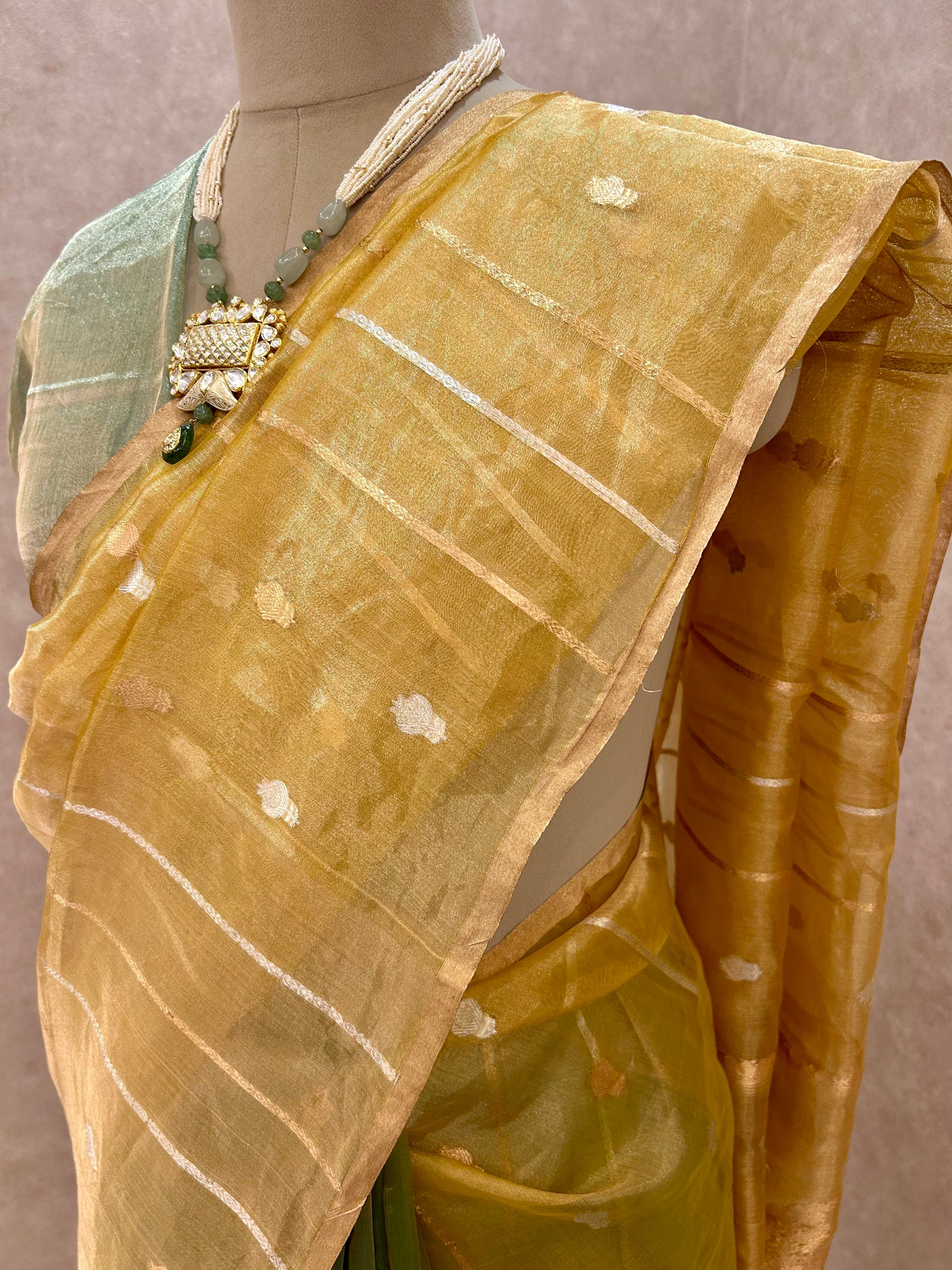 Elevate your festive wardrobe with this stunning Tricolour Tissue Saree, featuring a vibrant blend of green, yellow, and blue. Crafted from luxurious tissue fabric, the saree is adorned with intricate sona rupa zari stripes and delicate bootis, exuding a captivating sheen.