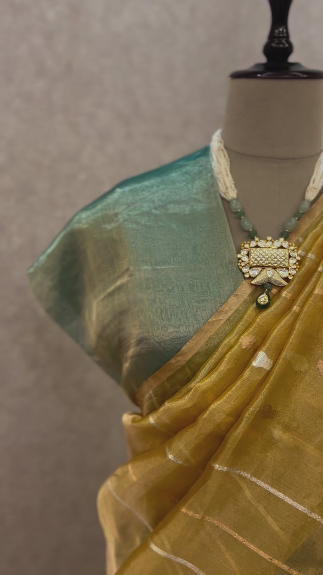 Style this vibrant tricolour tissue saree with stunning kundan jewelry to enhance its regal appeal. Opt for a layered kundan necklace and matching earrings to create a captivating focal point, while delicate bangles will add a touch of sparkle to your wrists. Complete the look with embellished juttis , ensuring you’re ready to dazzle at any day or night event.