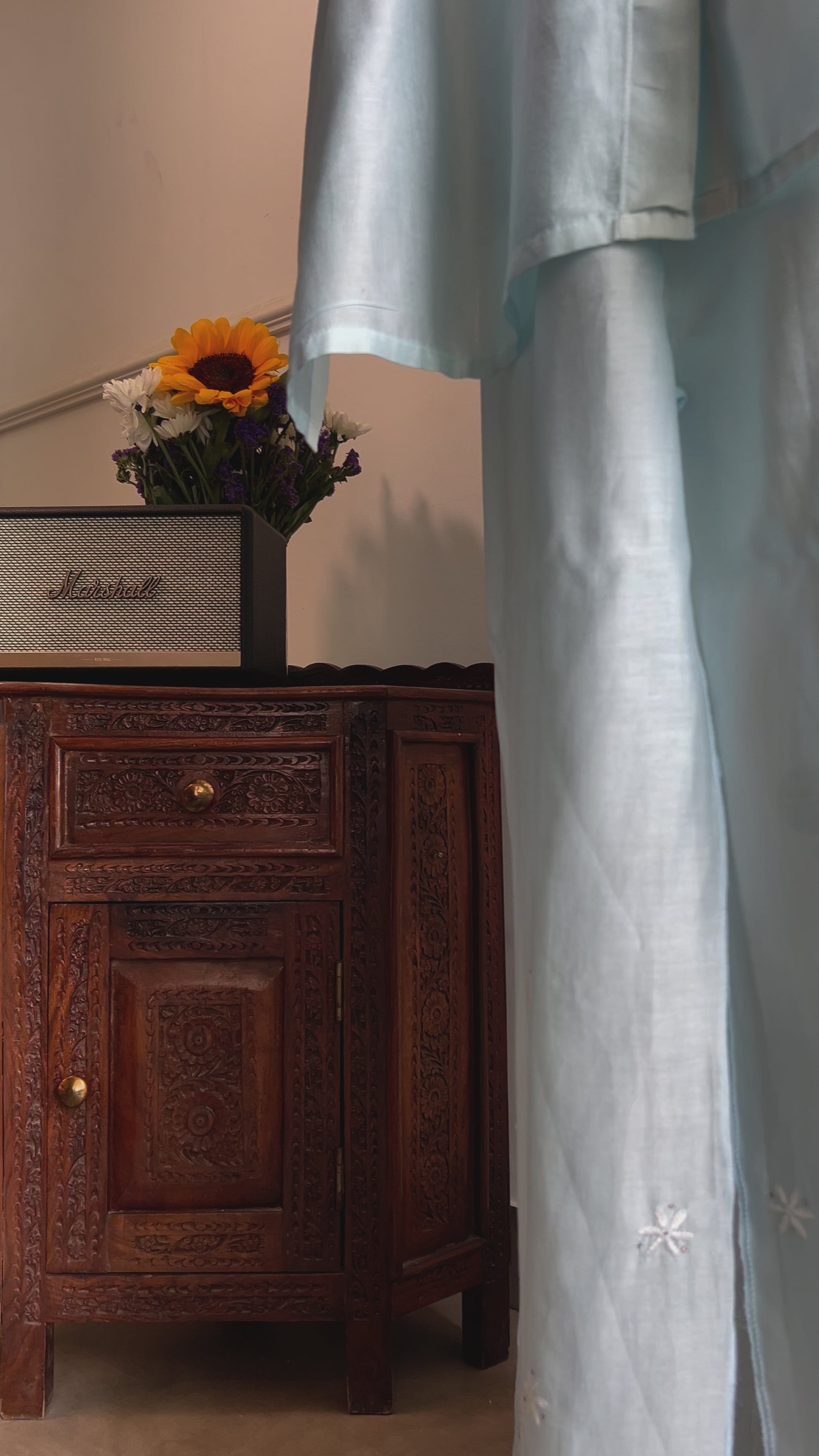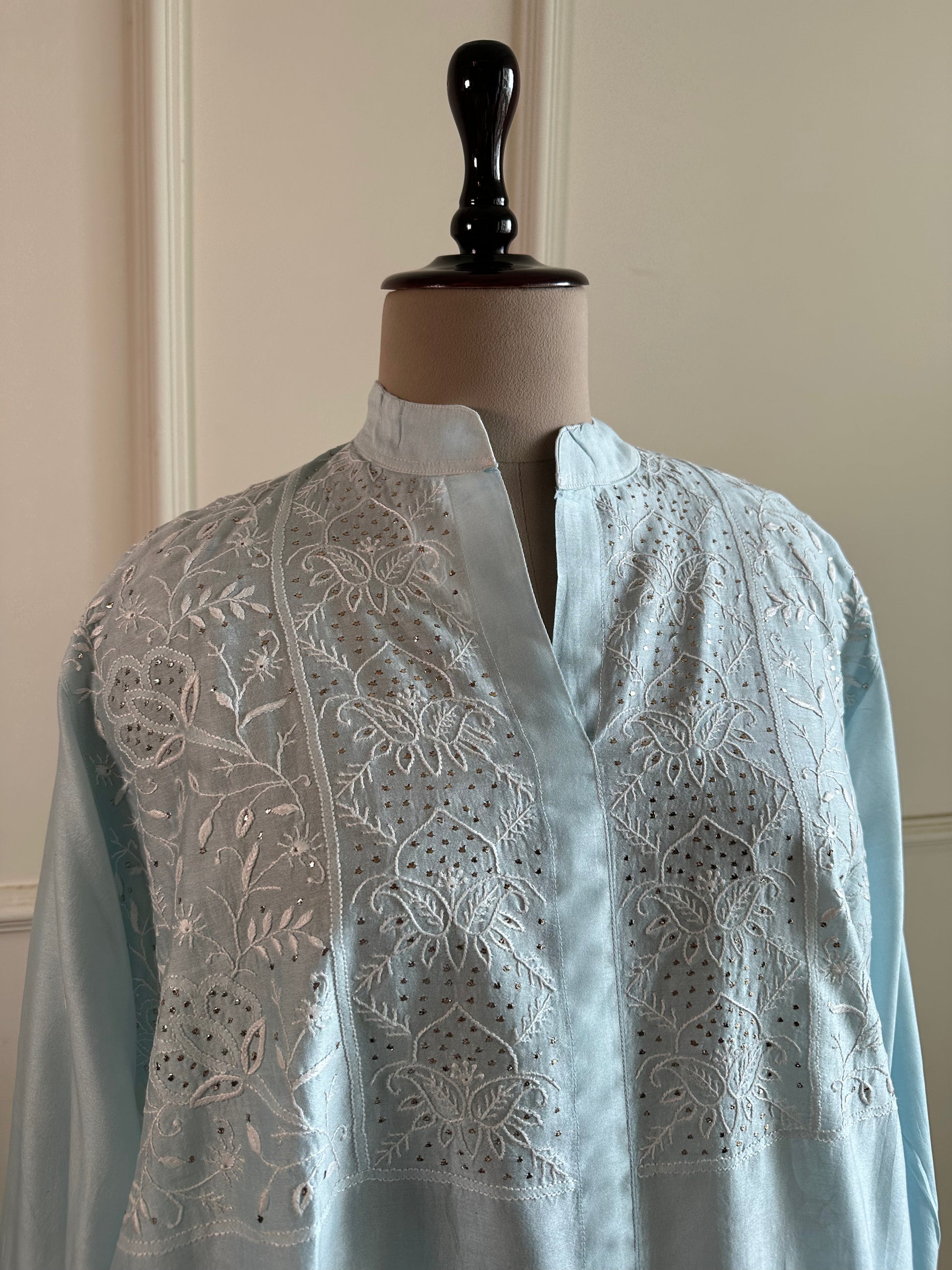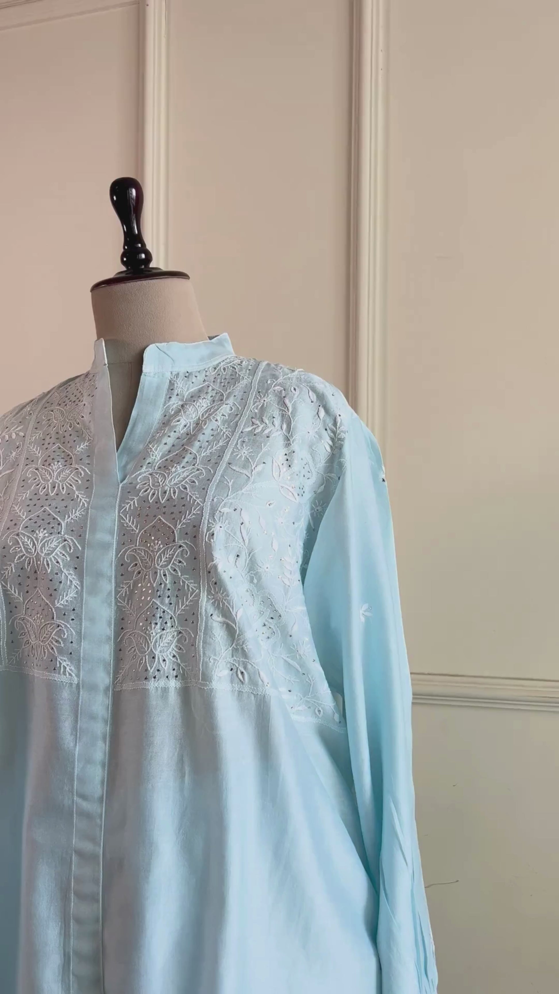 Breeze through the day in this powder blue co-ord set, crafted in feather-light mul chanderi. The top features a modern yoke silhouette with intricate chikankari and floral bootis on soft bell sleeves, while scattered motifs grace the back.