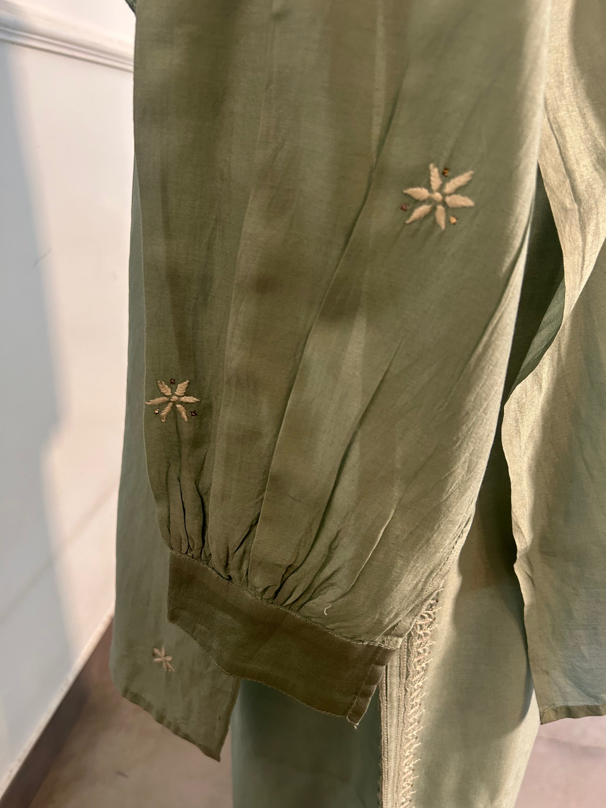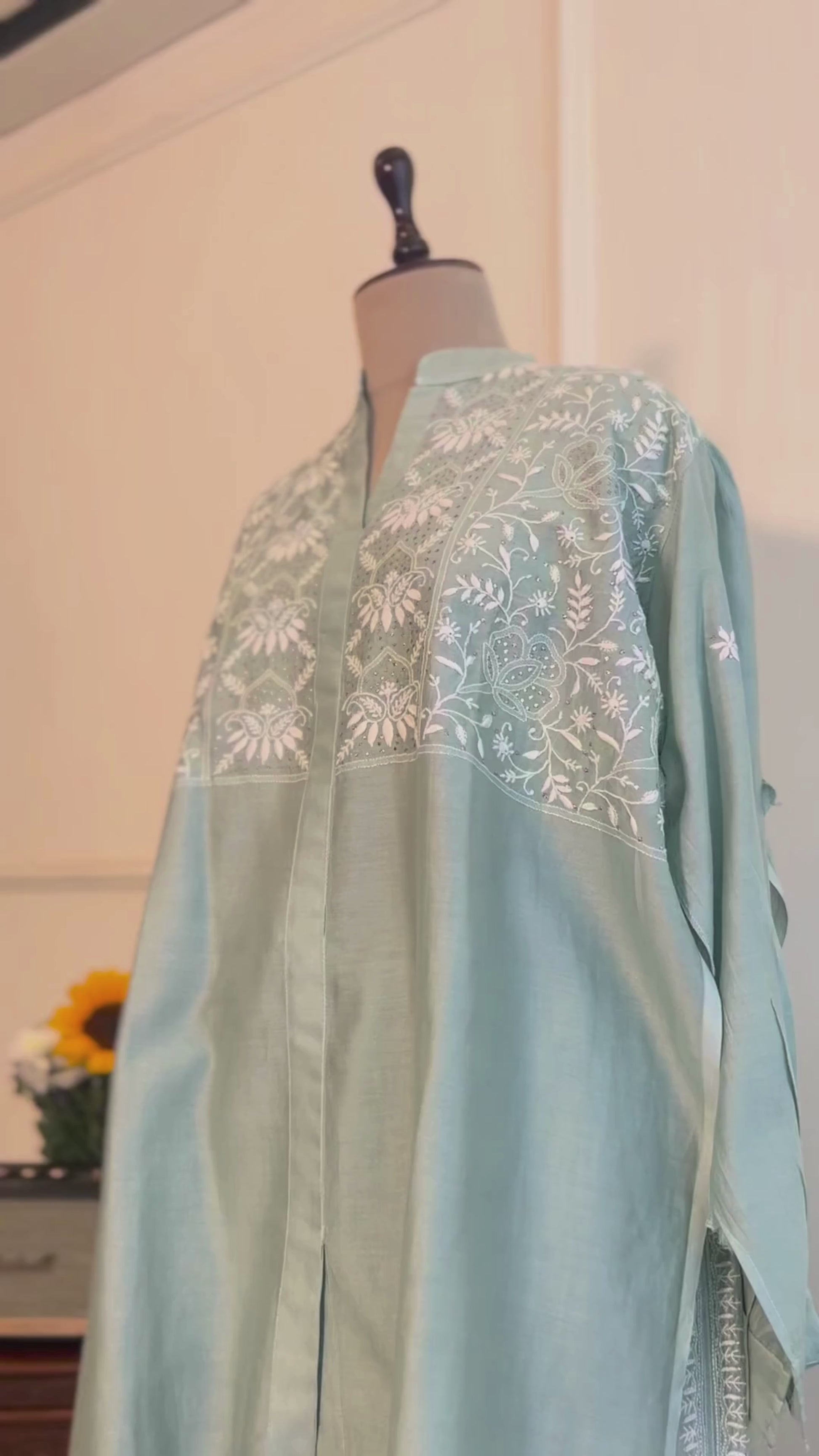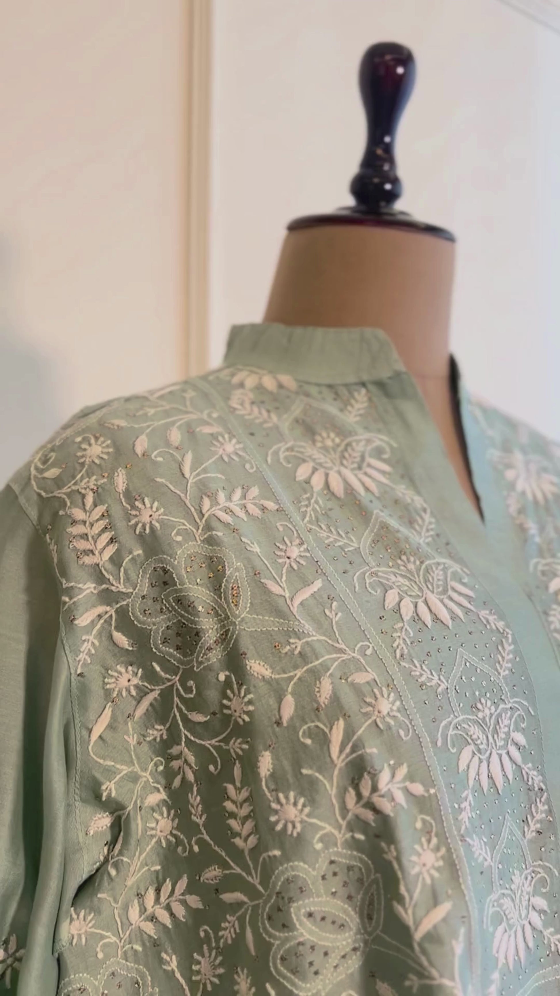 Effortlessly elegant, this dusty green mul chanderi co-ord set pairs traditional chikankari with modern ease. The yoke-style top features floral bootis on bell sleeves and embroidered motifs on the back, with a hint of mukaish shimmer.
